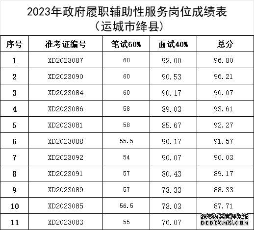 一、運(yùn)城市迅達(dá)人力資源服務(wù)有限公司2023年政府履職管理服務(wù)輔助性崗位考試已如期進(jìn)行,現(xiàn)成績公示如下: